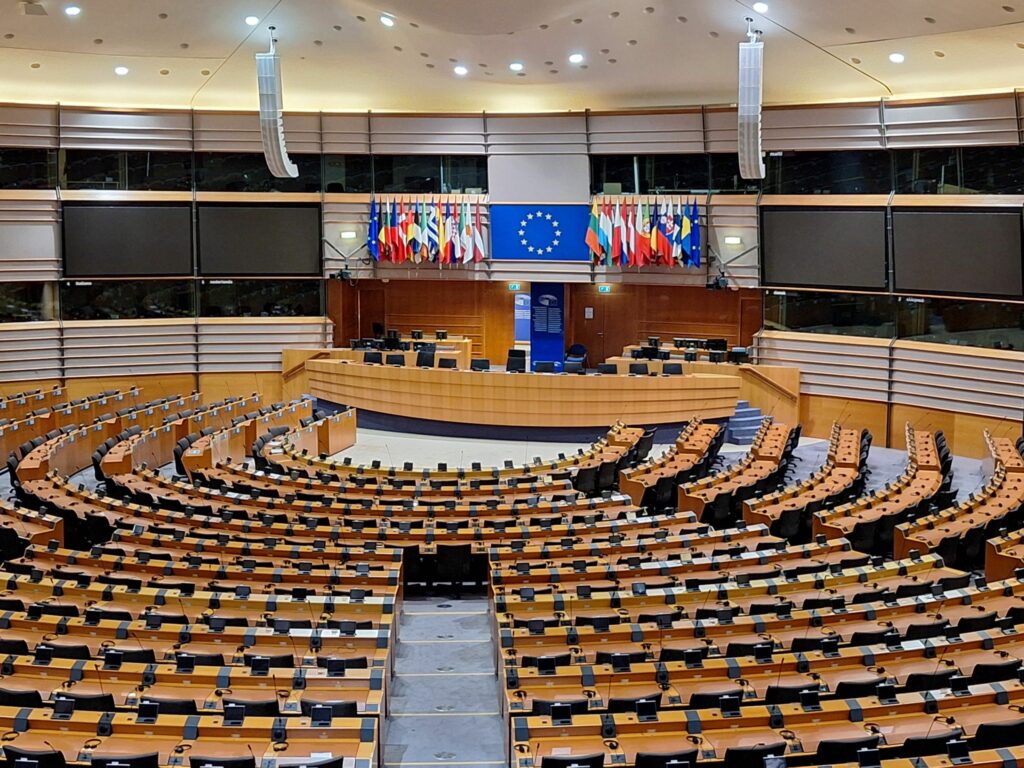 Das Gebäude des Europäischen Parlaments in Brüssel wurde vorgeblich als Messe- und Kongreßzentrum gebaut. „Weitsichtigerweise“ wurden aber bereits Dolmetschkabinen für mehr als 24 Amtssprachen vorgesehen – hier zu sehen in zwei Ebenen über den Abgeordnetenplätzen. Private Fotos dürfen nur außerhalb von Sitzungszeiten aufgenommen werden.