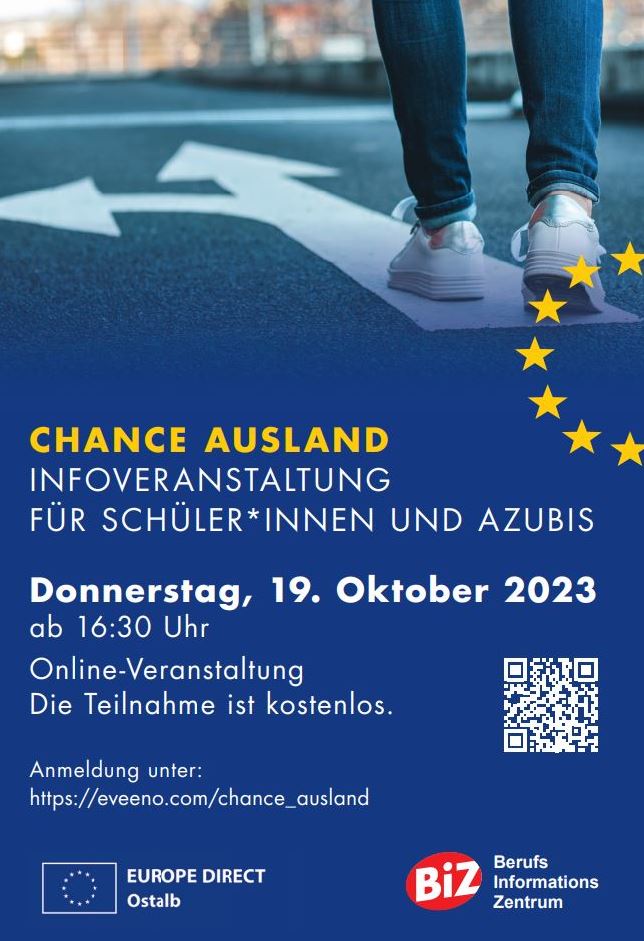 Du bist Schüler*in oder Azubi und willst Auslandserfahrung sammeln oder einfach mal raus in die Welt? Dann sei dabei am 19.10.2023 ab 16:30 Uhr. Vorträge und Erlebnisberichte zu verschiedenen Austauschprogrammen, Beratung und Tipps durch die Referenten und Antworten auf persönliche Fragen.