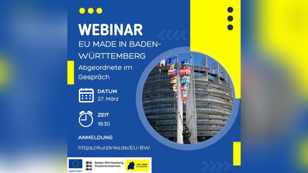 Wir laden Sie herzlich zu einer spannenden Online-Diskussion mit ihren Europaabgeordneten aus Baden-Württemberg ein. Nutzen Sie die Gelegenheit, direkt mit ihren Abgeordneten ins Gespräch zu kommen und über die aktuellen Herausforderungen Europas sowie Ihre Erwartungen für die Zukunft zu diskutieren.