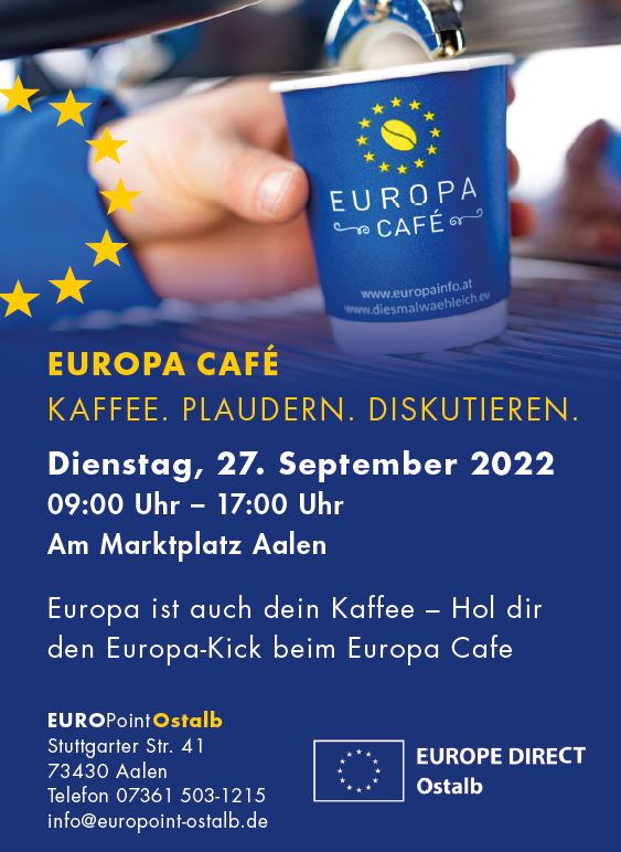 Bei einem anregenden, frisch zubereiteten Kaffee in entspannter Atmosphäre am Marktplatz in Aalen bietet das Europa-Café die Gelegenheit ins Gespräch zu kommen und sich über europäische Themen zu unterhalten, zu informieren und einzubringen.