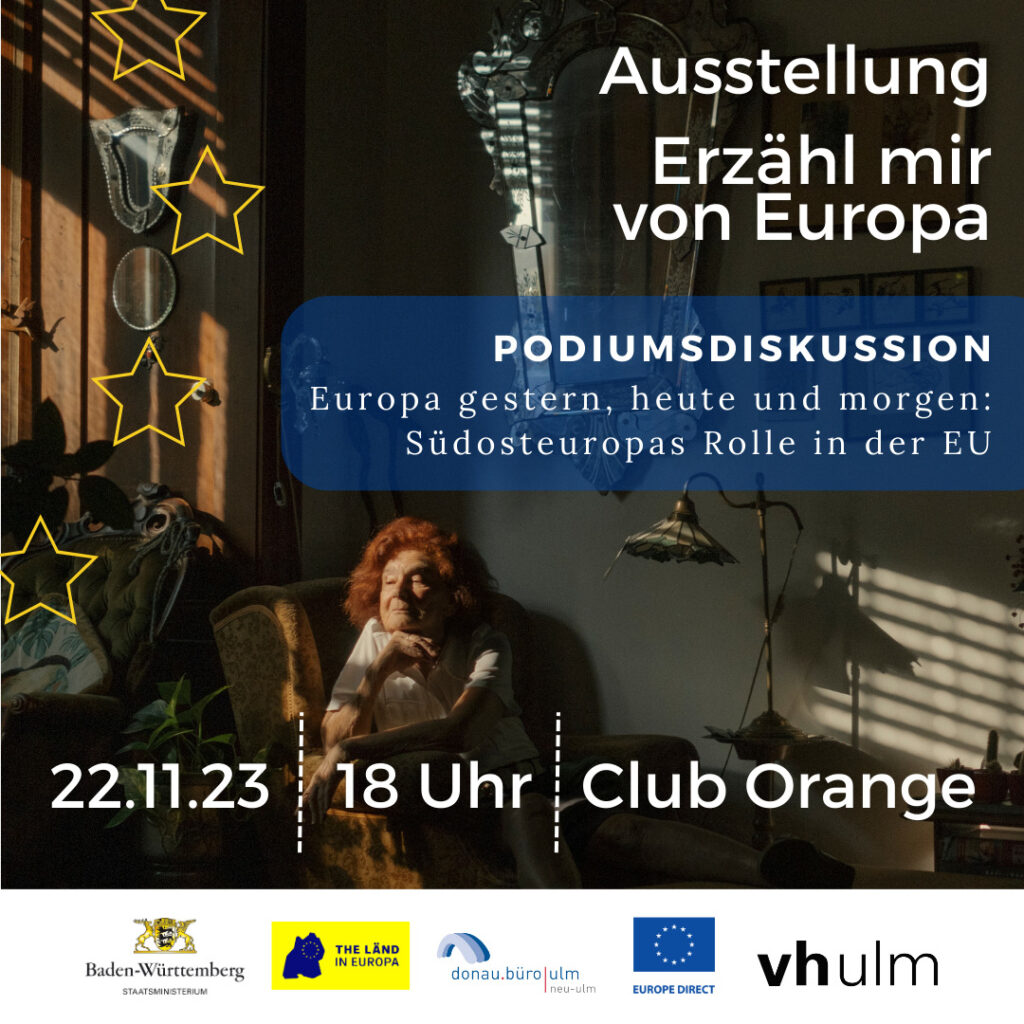 Anlässlich der Ausstellung „Erzähl mir von Europa“ laden das Donaubüro Ulm/Neu-Ulm und sein Europe Direct Zentrum sowie die vh ulm zu einer spannenden Diskussion in den Club Orange ein. Das Staatsministerium Baden-Württemberg und die Vertretung der Europäischen Kommission in Deutschland sind Kooperationspartner bei dieser Veranstaltung und unterstützen diese finanziell. Das europäische Haus kann nicht ohne den Donauraum gebaut werden, davon sind wir in Ulm und Neu-Ulm zutiefst überzeugt. Doch welche Rolle spielt Südosteuropa in der EU? Wo besteht Handlungsbedarf, sowohl im Inneren der EU als auch mit Blick auf die Staaten, die noch Teil der EU werden wollen? Was wollen wir für die Zukunft Europas und was muss konkret getan werden? Diese und weitere Fragen diskutieren wir angelehnt an die Leitthemen der Ausstellung: Kriege und Konflikte, Freiheit, Demokratie, Rückkehr von Nationalismus.