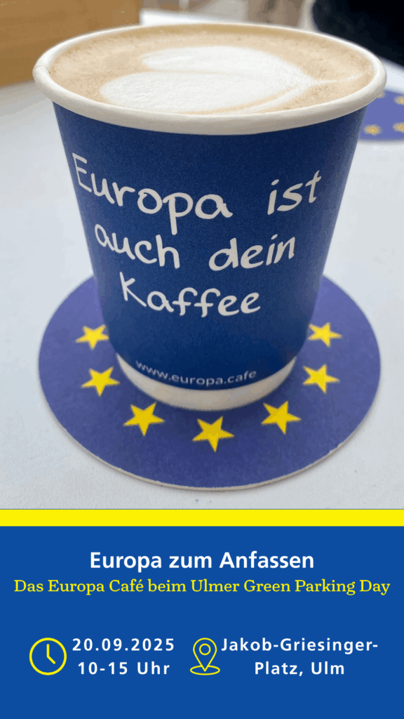 Am Samstag, den 20. September 2025, findet im Ulmer Wengenviertel unter dem Motto „Stadt – Grün – (Er)Leben!“ der Green Parking Day statt. Auch das Donaubüro Ulm/Neu-Ulm und sein Europe Direct Zentrum sind wieder mit dabei – und bringen dieses Jahr eine ganz besondere Aktion mit: Das Europa Café ist Teil unseres Programms!