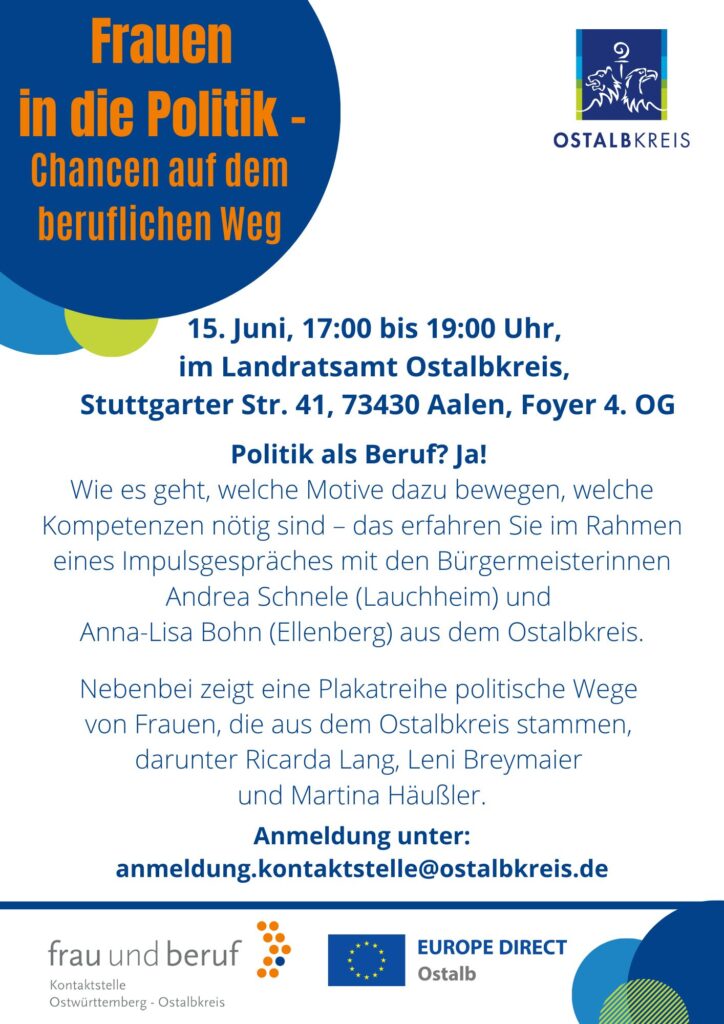 Die Bürgermeisterinnen Andrea Schnele (Lauchheim) und Anna-Lisa Bohn (Ellenberg) sprechen über ihre Motive und welche Kompetenzen in Politik als Beruf nötig sind. Nebenbei zeigt eine Plakatreihe politische Wege von Frauen, die aus dem Ostalbkreis stammen, darunter Ricarda Lang, Leni Breymaier und Martina Häußler.