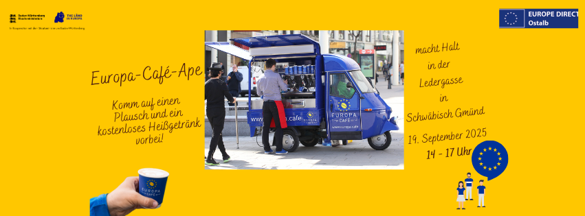 Am Donnerstag, 18. September 2025, verwandelt sich der Schillerplatz in Stuttgart von 11:00 bis 17:00 Uhr in ein mobiles Forum für Europa: Die Europa Café Ape lädt alle Bürger*innen ein, bei einer Tasse Kaffee oder Tee Europa kennenzulernen, ins Gespräch zu kommen und spielerisch Neues zu entdecken. Was erwartet Sie? Informationen & Gespräche Infomaterialien und Publikationen zu EU-Themen, Programmen und Beteiligungsmöglichkeiten Persönliche […]